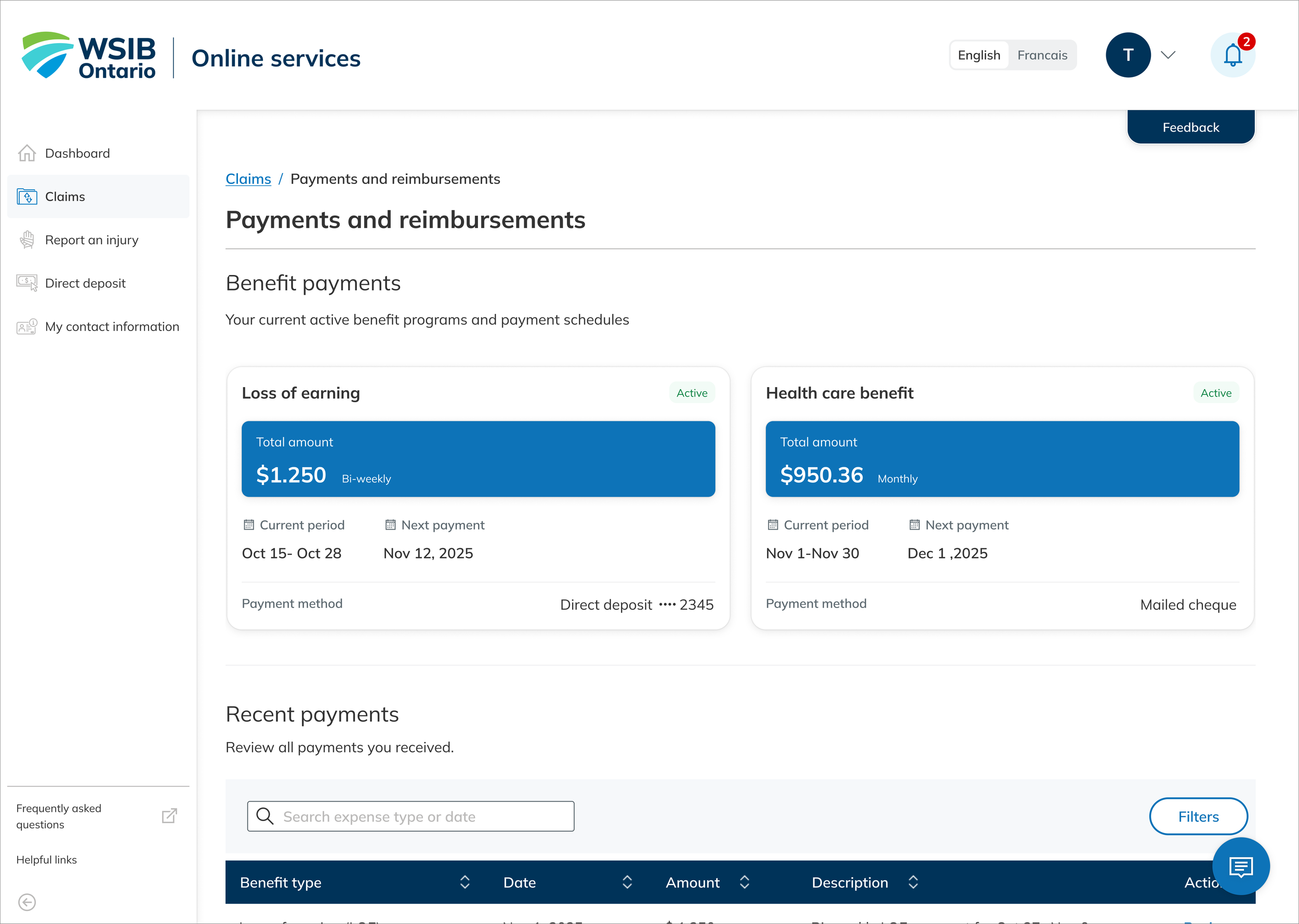 I began by surfacing the most important information upfront. The landing page now displays users’ latest WSIB payments and recent expense updates, with clear CTAs linking to detailed views. This creates immediate clarity and reduces the need to navigate multiple sections.