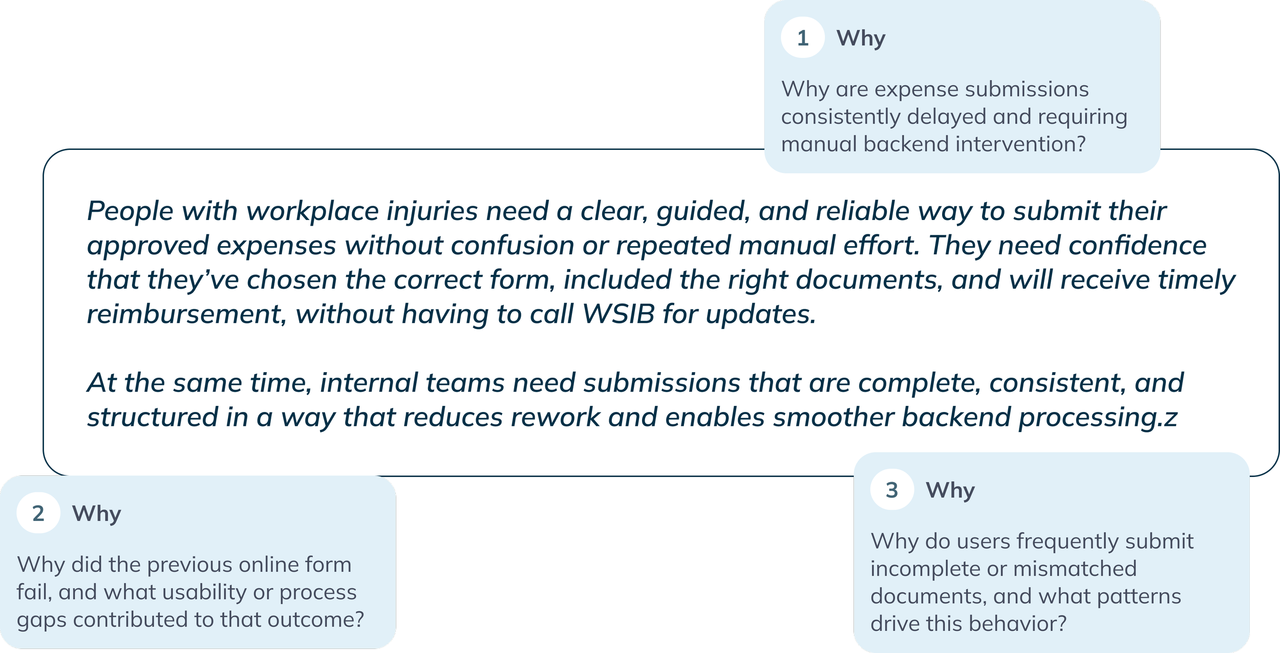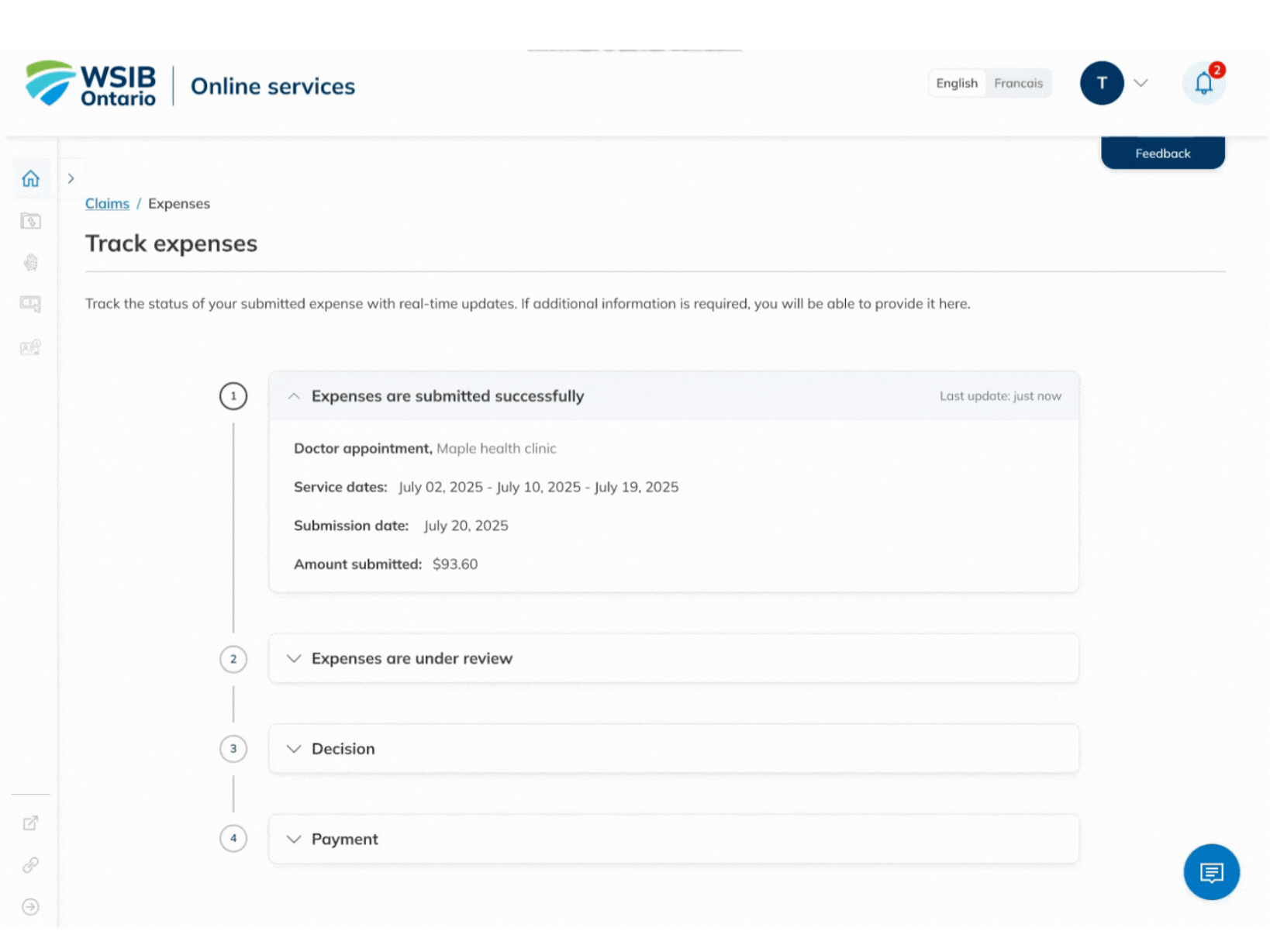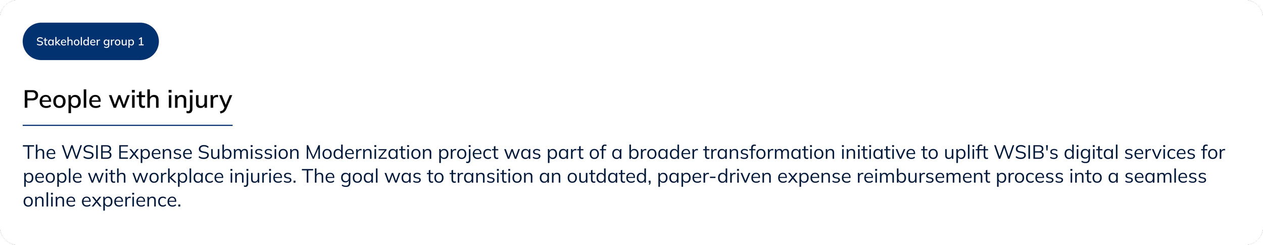 The WSIB Expense Submission Modernization project was part of a broader transformation initiative to uplift WSIB's digital services for people with workplace injuries. The goal was to transition an outdated, paper-driven expense reimbursement process into a seamless online experience