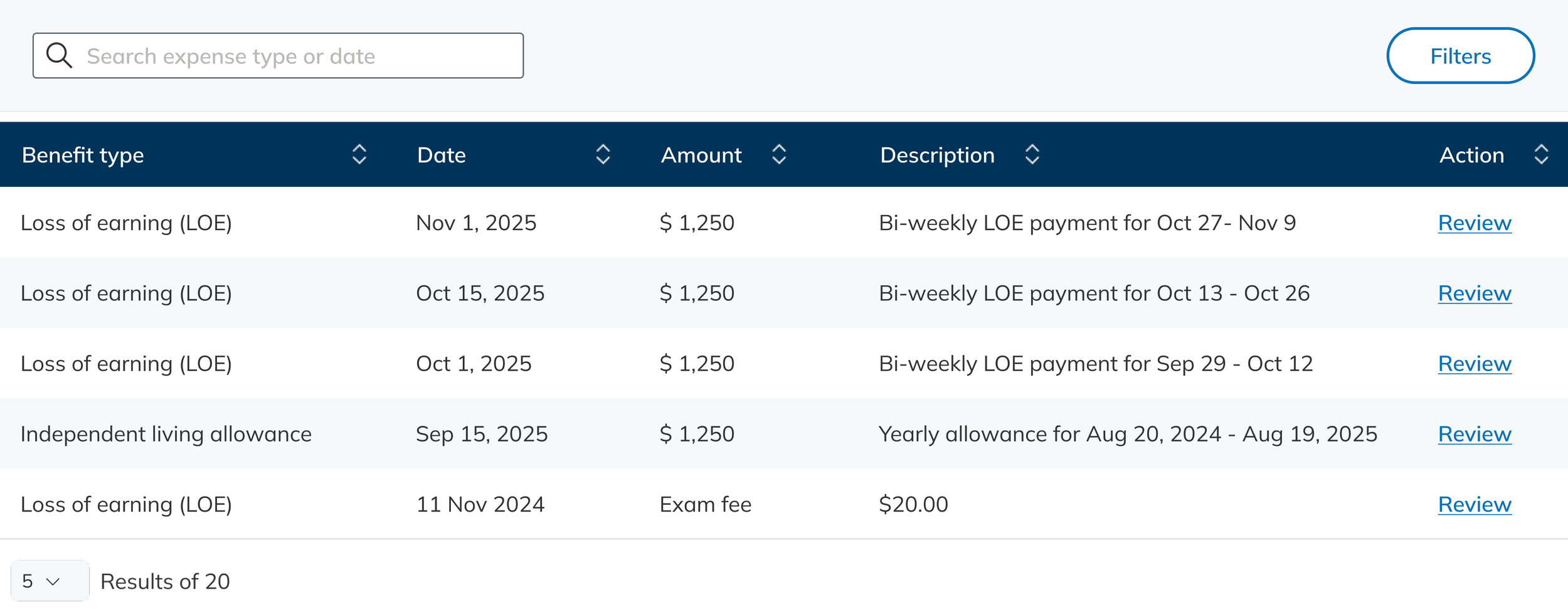 Shows recurring WSIB payments with key details like benefit period and payment method.